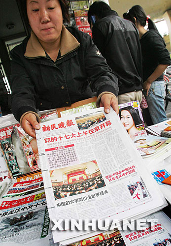 10月15日下午,上海市一位報攤攤主正在擺放刊載十七大新聞的本地報紙。當日,中國共產黨第十七次全國代表大會在北京人民大會堂隆重開幕。