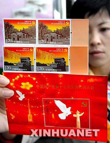 10月15日,一名集郵愛好者正在展示十七大紀念郵票和小型張。當日,為慶祝中國共產黨第十七次全國代表大會的勝利召開,國家郵政局發行《中國共產黨第十七次全國代表大會》紀念郵票一套兩枚,小型張一枚。