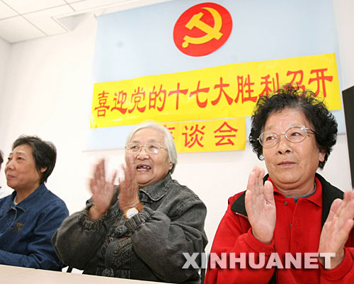 10月15日,北京宣武門廣外街道車站西街15號院社區黨員在收看十七大開幕會后舉行座談會。