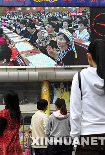 10月15日,市民在南京新街口街頭一大屏幕前觀看十七大開幕會電視直播。