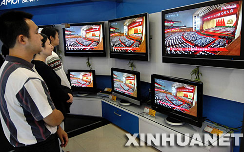 10月15日,市民和商場員工在南京一商場的電視機柜臺前,觀看十七大開幕會電視直播。