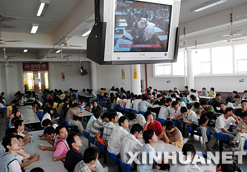 10月15日,福州大學學生在學校食堂通過電視觀看十七大開幕電視直播。