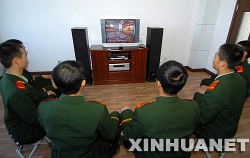 10月15日,山東公安邊防總隊威海市支隊的戰士在收看十七大開幕電視直播。
