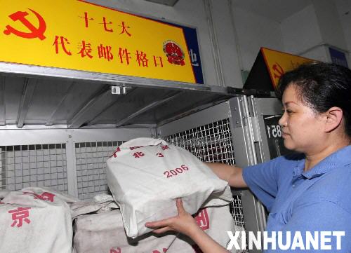10月15日,一位工作人員在北京郵區(qū)中心局分揀十七大相關(guān)信件。