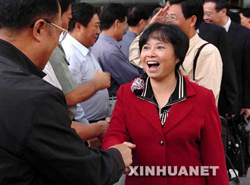 10月13日,出席中國共產(chǎn)黨第十七次全國代表大會的福建代表團(tuán)代表啟程赴京。這是十七大代表黃金蓮與送行人員握手話別。