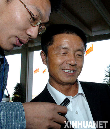 10月12日,出席中國共產黨第十七次全國代表大會的江西代表團代表抵達北京。這是一名代表(右)在接受記者的采訪。