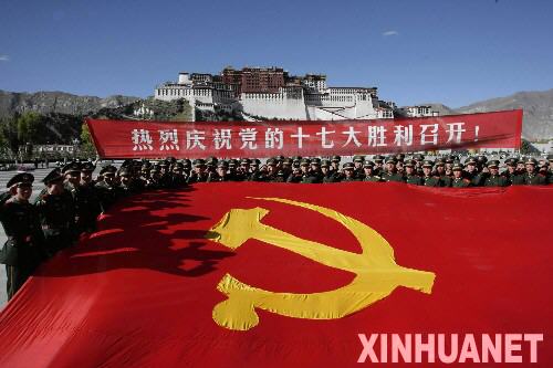 10月15日,西藏武警總隊駐拉薩部隊百余名黨員在布達拉宮廣場以重溫入黨誓詞的方式歡慶黨的十七大勝利召開。 新華社發(fā)(趙艷志攝)