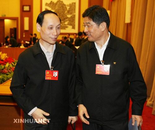 10月16日,中直機關代表團在北京分組審議十七大報告,這是田聰明代表(右)和翟衛(wèi)華代表在會后交流。 新華社記者黃敬文攝
