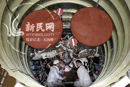 “嫦娥一號”發射在即,科技人員在火箭內做最后檢測。新民晚報新民網特派西昌記者 紀海鷹 攝