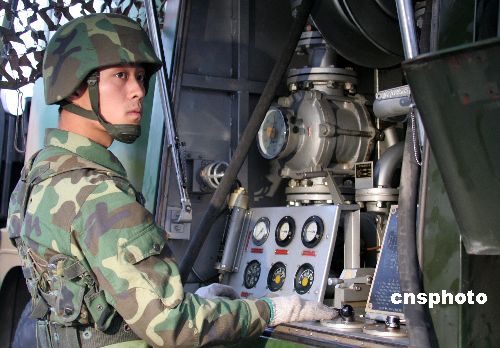 參演部隊機動途中油料補給。10月28日,鐵拳-2007機步師實兵檢驗性演習部隊在機動途中展開防持久毒劑襲擊,化學偵察,道路消毒,裝備消毒,人員消毒等科目演練。中新社發曾憲平 攝