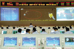 昨天,科技人員在北京飛控中心為嫦娥一號(hào)衛(wèi)星變軌做準(zhǔn)備。新華社記者田兆運(yùn)攝