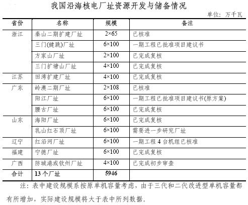 該《規劃》指出,經過多年努力,中國已儲備了一定規模的核電廠址資源。除已建和在建工程外,在沿海地區開展前期工作已較充分的廠址還有5000多萬千瓦(見上表)。此外,2004年以來,在廣東粵東(田尾廠址)地區,浙江浙西地區、湖北、江西、湖南等地都開展了核電廠址普選工作,進一步增加了核電廠址儲備。