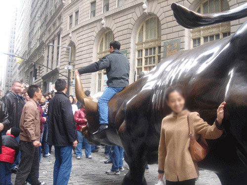 中國(guó)日?qǐng)?bào)網(wǎng)環(huán)球在線消息:北京電視臺(tái)主持人王芳最近到紐約旅游,在華爾街偶遇一群內(nèi)地游客,在著名公牛銅雕塑前做出種種不文明的舉動(dòng),令老外搖頭圍觀看熱鬧,有些則繞道而行。王芳拍下此“奇觀”后張貼到其博客上,再次引來(lái)有關(guān)內(nèi)地游客素質(zhì)問(wèn)題的討論。