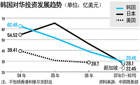 大韓貿易投資振興公社11月29日表示,據中國商務部的統計資料,今年1~10月韓國對華投資達29.45億美元。大韓貿易投資振興公社解釋說:“雖然韓國對中國大陸的投資與香港(186.55億美元)、英屬維爾京群島(129.14億美元)相比,其規模相當小。但香港是中國的一部分,維爾京群島是避稅地區,有各國投資者云集,因此,論主權國家,韓國是實際上是第一對華投資國。”