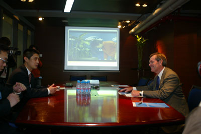 2007年12月10日上午,美國衛生部長萊維特(右)與中國日報網總裁高岸明(左)在交談