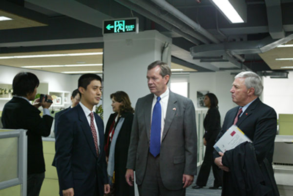 2007年12月10日上午,美國衛生與公眾服務部部長萊維特成功結束訪談后,在中國日報網總裁高岸明的陪同下參觀中國日報網站。