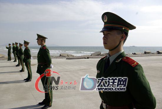 武警戰士在碼頭上設置警戒線。(圖片來自:大洋網)
