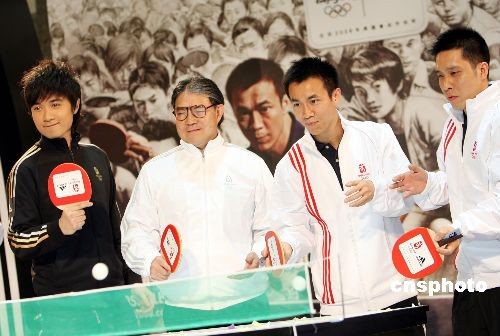 資料圖:三月五日,港協暨奧運會會長霍震霆(左二)、香港藝人古巨基(左)與香港乒乓球好手李靜(右二)、高禮澤在時代廣場出席adidas迎奧運活動,為儀式主持開球典禮。中新社發 洪少葵 攝