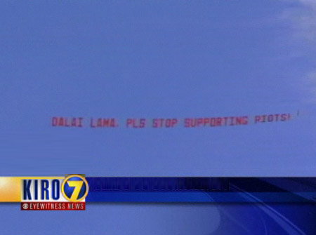 4月12日,達賴喇嘛在美國西雅圖演講,一架飛機拖著橫幅,上面用英文寫道:"Dalai Lama, PLS stop supporting riots!" (中文意思:“達賴喇嘛,請停止支持暴亂!”)