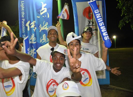 4月14日,參加城市慶典的當(dāng)?shù)厣倌陜和诒本W運會火炬?zhèn)鬟f宣傳旗幟前合影。當(dāng)日,北京奧運圣火傳遞活動在阿曼馬斯喀特舉行。新華社記者安治平攝(來源:新華社)