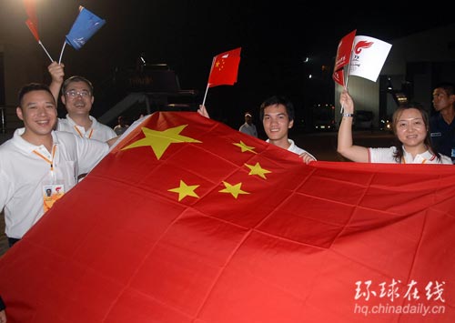 4月18日,中國(guó)使館工作人員手舉國(guó)旗迎接奧運(yùn)圣火的到來(lái)。當(dāng)日,運(yùn)送北京奧運(yùn)圣火的專機(jī)從印度新德里飛抵奧運(yùn)火炬境外傳遞的第12站――泰國(guó)首都曼谷。 新華社記者公磊攝