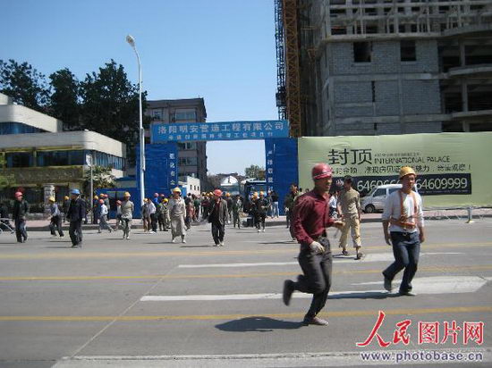 5月12日,洛陽市民正在跑出房屋、工地躲避地震