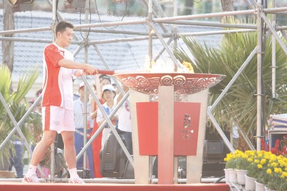 福建境內最后一棒火炬手陳宏點燃圣火盆 攝影 胡美東