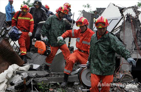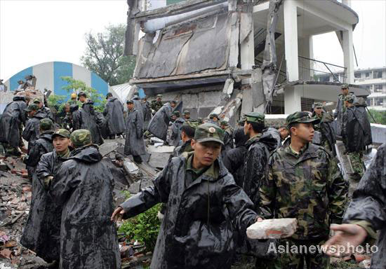 2008年5月13日,救援人員繼續(xù)在四川都江堰市聚源鎮(zhèn)聚源中學(xué)冒雨進(jìn)行救援工作。9時許,經(jīng)過6個多小時的奮戰(zhàn),救援人員成功將第一名幸存者救出廢墟。