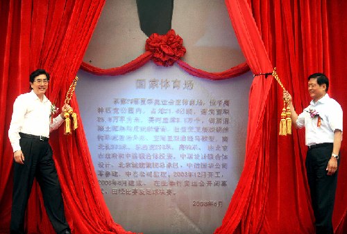 6月28日,中共中央政治局委員、北京市委書(shū)記、北京奧組委主席劉淇(右)與北京市委副書(shū)記、北京市市長(zhǎng)、北京奧組委執(zhí)行主席郭金龍為國(guó)家體育場(chǎng)落成紀(jì)念柱揭幕。當(dāng)日,國(guó)家體育場(chǎng)(鳥(niǎo)巢)舉行落成典禮。 新華社記者羅曉光攝