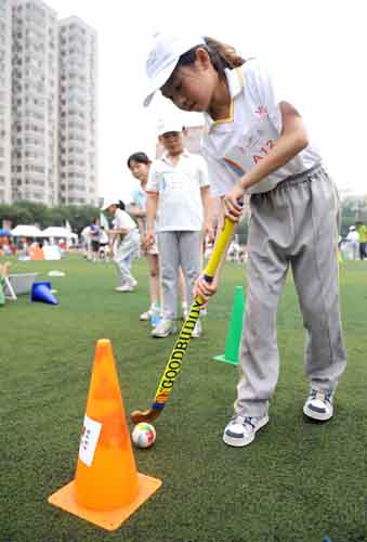 6月28日,社區(qū)小朋友在體驗殘奧項目坐式排球運動。當日,北京奧運會獎牌贊助商必和必拓公司在北京舉辦了奧運社區(qū)行活動,少年兒童和他們的父母在專業(yè)體育教練的指導下體驗了多個奧運會和殘奧會體育項目。 新華社記者羅曉光攝