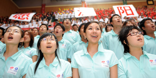 沈陽賽區舉行志愿者誓師大會 6月29日,志愿者在沈陽建筑大學高唱《歌唱祖國》。當日,千余名志愿者參加在沈陽建筑大學舉行的北京奧運會足球比賽沈陽賽區志愿者誓師大會,并集體宣讀誓言。 新華社記者李鋼攝