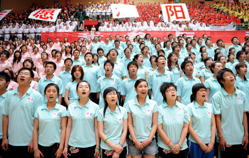 沈陽賽區(qū)舉行志愿者誓師大會 6月29日,志愿者在沈陽建筑大學(xué)高唱《歌唱祖國》。當(dāng)日,千余名志愿者參加在沈陽建筑大學(xué)舉行的北京奧運會足球比賽沈陽賽區(qū)志愿者誓師大會,并集體宣讀誓言。 新華社記者李鋼攝