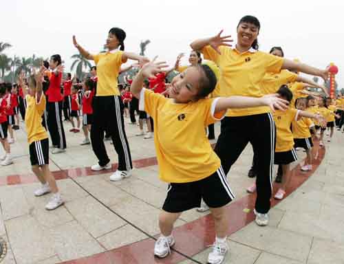 6月29日,家長們和孩子們一起做親子體操。當日,500名兒童和500名家長一起在南寧市南湖水幕電影廣場一起做親子體操,表達迎接奧運的喜悅心情。 新華社記者周華攝