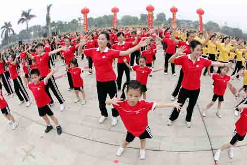 6月29日,家長(zhǎng)們和孩子們一起做親子體操。當(dāng)日,500名兒童和500名家長(zhǎng)一起在南寧市南湖水幕電影廣場(chǎng)一起做親子體操,表達(dá)迎接奧運(yùn)的喜悅心情。 新華社記者周華攝