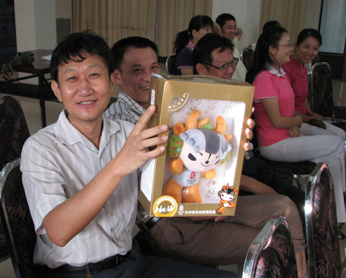 2008年6月30日 中國駐坦使館舉辦奧運知識競答 6月29日,在坦桑尼亞首都達累斯薩拉姆,觀眾劉忠利展示他參與答題獲得的獎品。中國駐坦使館當天在此舉辦北京奧運會知識競答活動。達累斯薩拉姆是北京奧運會火炬途徑的唯一非洲國家城市。 新華社記者義高潮攝