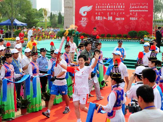 7月10日,第一棒火炬手娜日蘇手持火炬?zhèn)鬟f。當(dāng)日,北京奧運圣火在內(nèi)蒙古自治區(qū)赤峰市傳遞。新華社記者劉力航攝