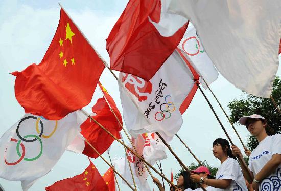 7月10日,旗手在起跑儀式前揮舞旗幟。當日,北京奧運圣火在內蒙古自治區赤峰市傳遞。新華社記者張領攝