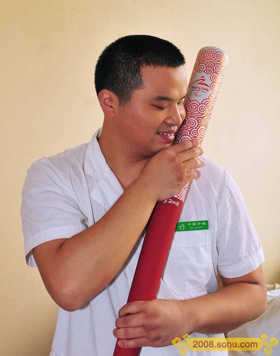 南京市殘疾人中醫(yī)康復(fù)服務(wù)中心的一名盲人醫(yī)生輕撫北京殘奧會(huì)火炬