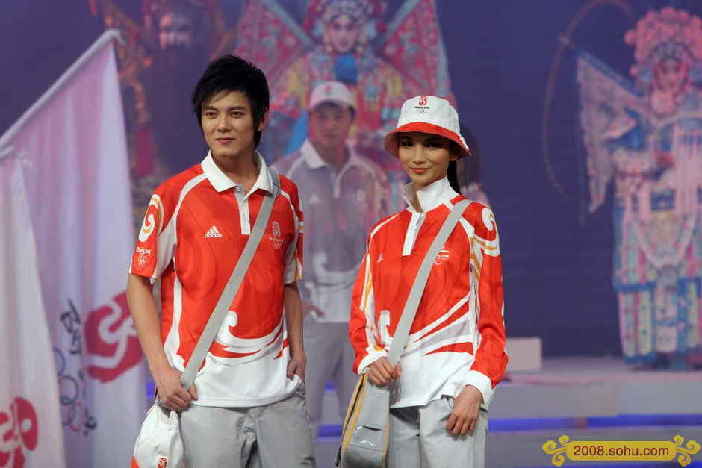 北京奧運會殘奧會制服采用核心圖形祥云圖案,工作人員制服為紅色,志愿者制服為藍色,技術官員制服為灰色。
