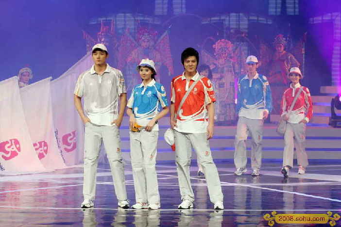 北京奧運會殘奧會制服采用核心圖形祥云圖案,工作人員制服為紅色,志愿者制服為藍色,技術官員制服為灰色。