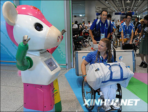 9月2日,“福牛樂樂”機器人在機場迎候參加殘奧會的外國運動員。
