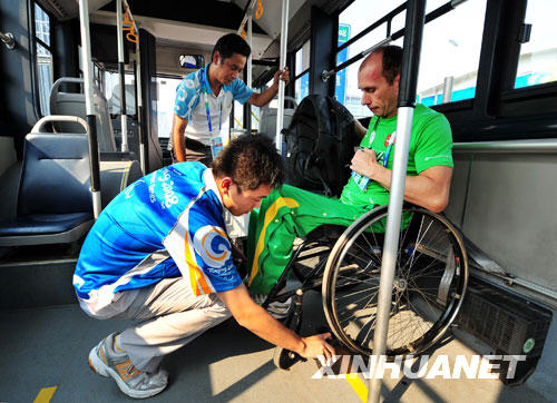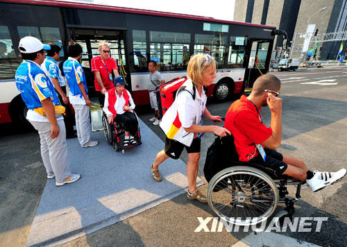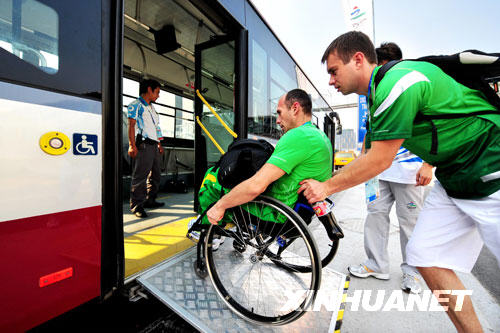 北京殘奧會為參賽的運動員提供了無障礙交通服務,殘奧專用大巴上設有輪椅專用席位,配備固定輪卡,安裝自動伸縮過橋、安全帶等,讓運動員真正實現了無障礙出行。據了解,參加本屆殘奧會的近4000名運動員中約有1900名輪椅運動員。新華社記者李紫恒攝