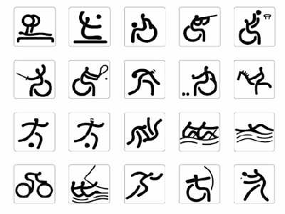 北京殘奧會體育圖標設計包括20個圖標,分別是射箭、田徑、自行車、馬術、7人制足球、盲人柔道、帆船、游泳、乒乓球、硬地滾球、5人制足球、盲人門球、舉重、射擊、坐式排球、輪椅籃球、輪椅擊劍、輪椅橄欖球、輪椅網(wǎng)球、賽艇。