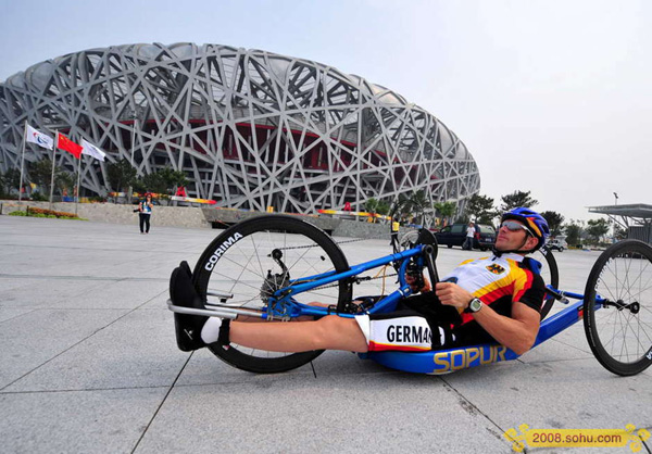 9月6日,一名徳國(guó)輪椅競(jìng)速運(yùn)動(dòng)員從“鳥(niǎo)巢”前駛過(guò)。北京殘奧會(huì)開(kāi)幕式將在國(guó)家體育場(chǎng)“鳥(niǎo)巢”舉行。新華社/圖
