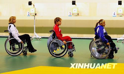 9月7日,斯洛伐克選手韋羅尼卡·瓦多維喬娃(中)、德國選手曼努埃拉·施默蒙德(左)和波多黎各選手妮爾達·戈麥斯·洛佩茲準備領獎。當日,在北京2008年殘奧會R2級女子10米氣步槍立射SH1(下肢殘疾)比賽中,韋羅尼卡·瓦多維喬娃以494.8環的總成績獲得金牌。施默蒙德和洛佩茲分別獲得銀牌和銅牌。新華社記者任勇攝