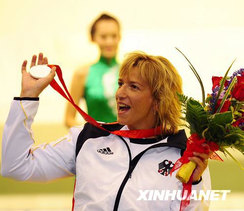 9月7日,德國選手曼努埃拉·施默蒙德在頒獎儀式上展示銀牌。當日,曼努埃拉·施默蒙德在北京2008年殘奧會R2級女子10米氣步槍立射SH1(下肢殘疾)比賽中,以490.2環的總成績獲得銀牌。新華社記者任勇攝