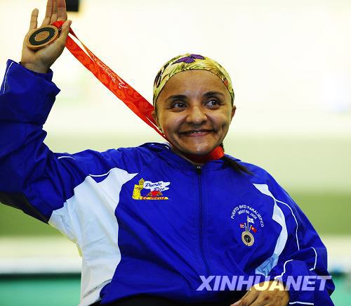9月7日,波多黎各選手妮爾達·戈麥斯·洛佩茲在頒獎儀式上展示銅牌。當日,妮爾達·戈麥斯·洛佩茲在北京2008年殘奧會R2級女子10米氣步槍立射SH1(下肢殘疾)比賽中,以489.2環的總成績獲得銅牌。新華社記者任勇攝