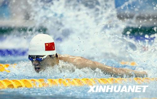 9月7日,中國選手郭智在男子100米蝶泳-S9預賽中以1分00秒38的成績晉級決賽。當日,北京2008年殘奧會游泳項目比賽在國家游泳中心“水立方”開賽。新華社記者丁旭攝