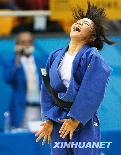9月7日,中國選手崔娜慶祝勝利。當日,在北京工人體育館舉行的北京2008年殘奧會女子柔道52公斤級決賽中,崔娜擊敗法國選手桑德里娜·奧里?!R蒂內,獲得冠軍。新華社記者廖宇杰攝