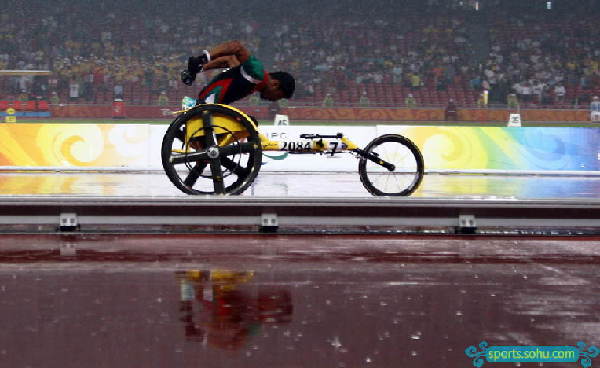 9日,阿聯(lián)酋選手瓦赫達(dá)尼在男子400米T54級半決賽中。北京2008年殘奧會田徑比賽在國家體育場冒雨進(jìn)行。新華社/圖